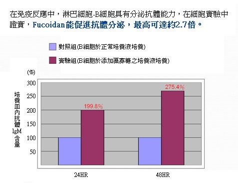 Fucoidan能活化巨噬細胞、B細胞、T細胞及自然殺手細胞( NK Cell )…等免疫細胞活性,可大幅提升免疫系統對外來病原體的抵抗力,故未來可將Fucoidan發展為協助對抗一般流行性感冒、禽流感、腸病毒、新流感…等之輔助食品。